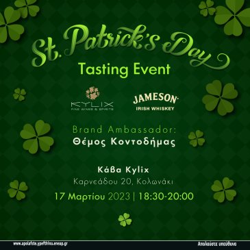 Η κάβα Kylix και το kylix.gr γιορτάζουν την Saint Patrick's Day σε συνεργασία με το Jameson Irish Whiskey με ένα ξεχωριστό tasting event!     Με τη καθοδήγηση του Brand Ambassador, Θέμου Κοντο...